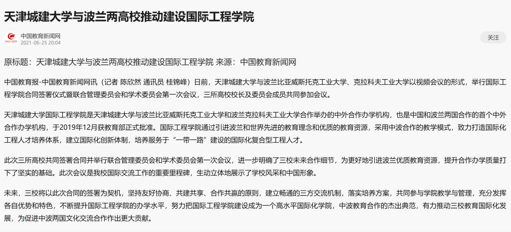 6月25日,中国教育新闻网对公海710线路与波兰两所高校共同签署合同并举行联合管理委员会和学术委员会第一次会议进行如下报道:
